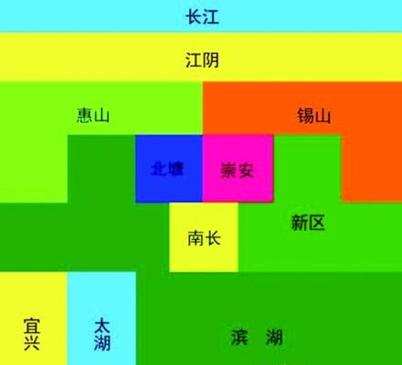该图巨细根本契合视觉,滨湖区最大,市中心三区巨细根本一样;惠山区和锡山区像无锡的两块肩胛骨,略大于新区。其实,画这样的示意图也是要必定的艺术功力的。首要,制图者需求深入研究各个区之间的方位、巨细联系。其次,需求用图形概括总结的方法,将各个区接壤处不规则的线成为横平竖直或许45度角的线条,尽量简化曲线而制成这样一幅示意图。